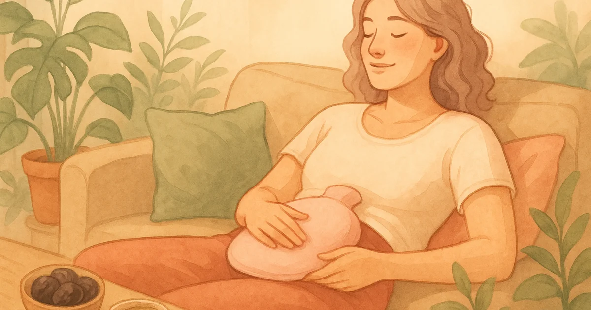 Soir : Repas léger, puis massage du ventre à l'huile pendant 10 minutes, suivi de la bouillotte. Je dors avec une infusion de menthe sur ma table de nuit.
