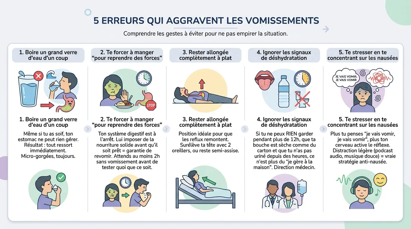 Te forcer à manger "pour reprendre des forces" Ton système digestif est à l'arrêt. Lui imposer de la nourriture solide avant qu'il soit prêt = garantie de revomir. Attends au moins 2h sans vomissement avant de tester quoi que ce soit.